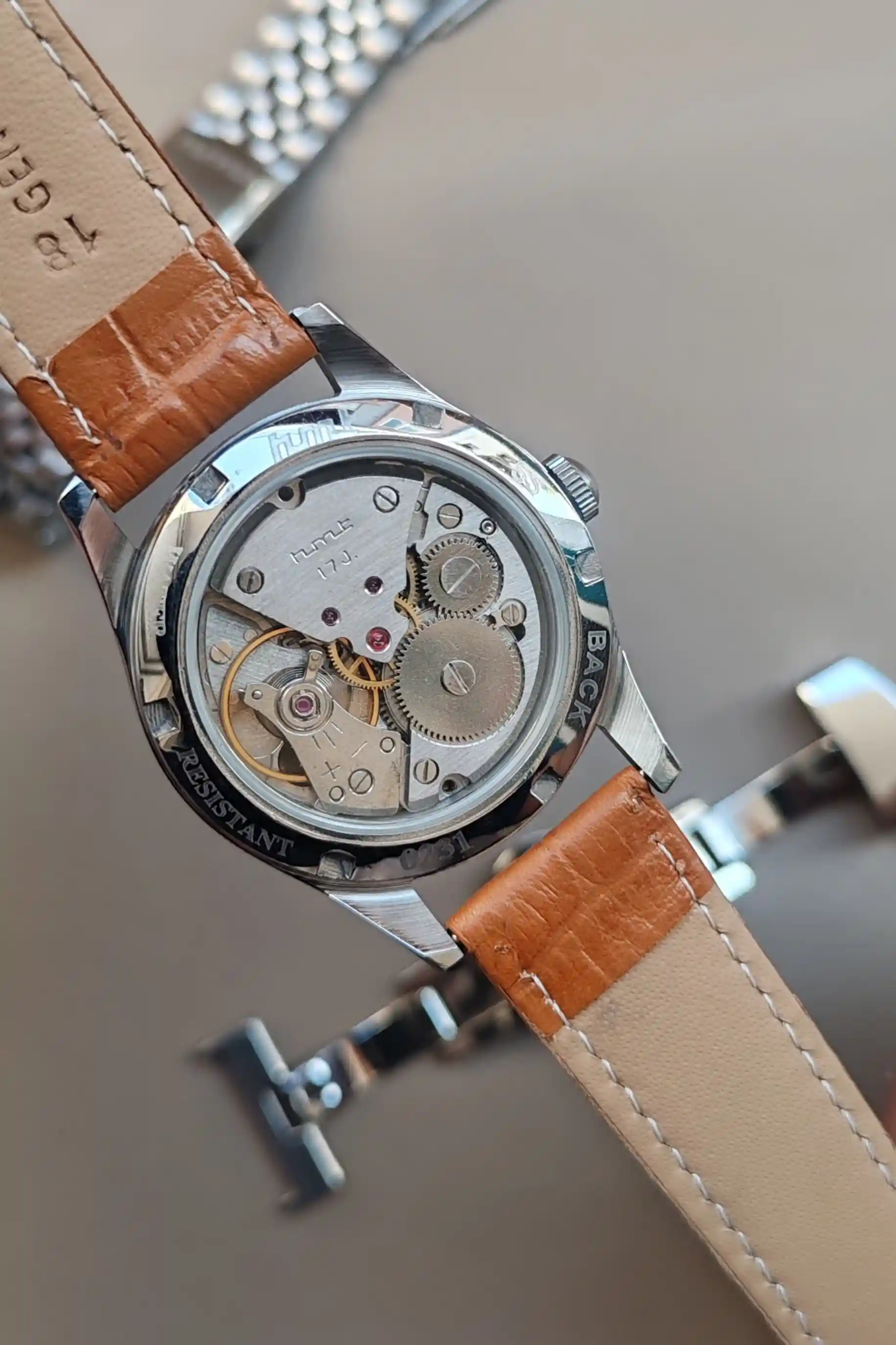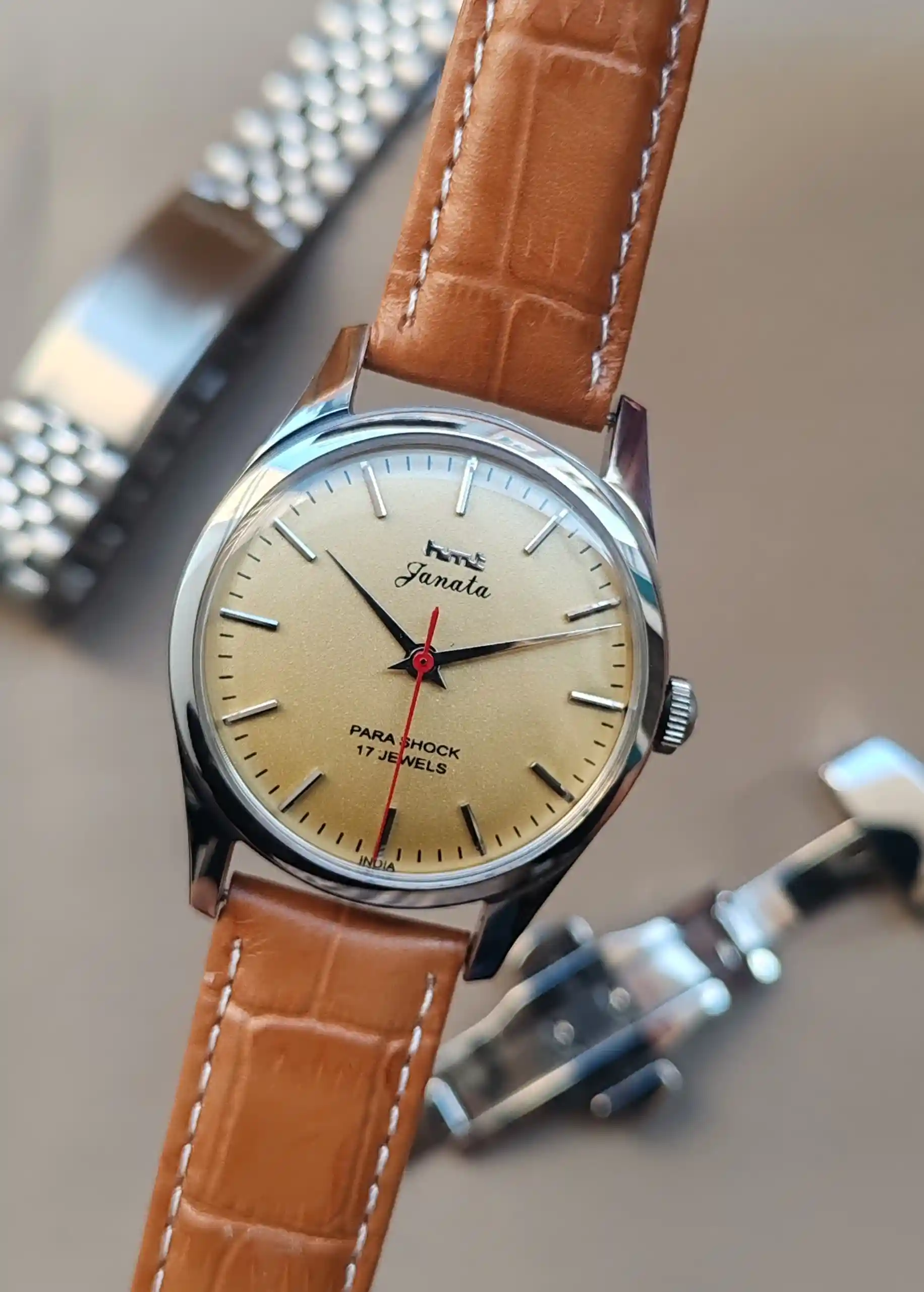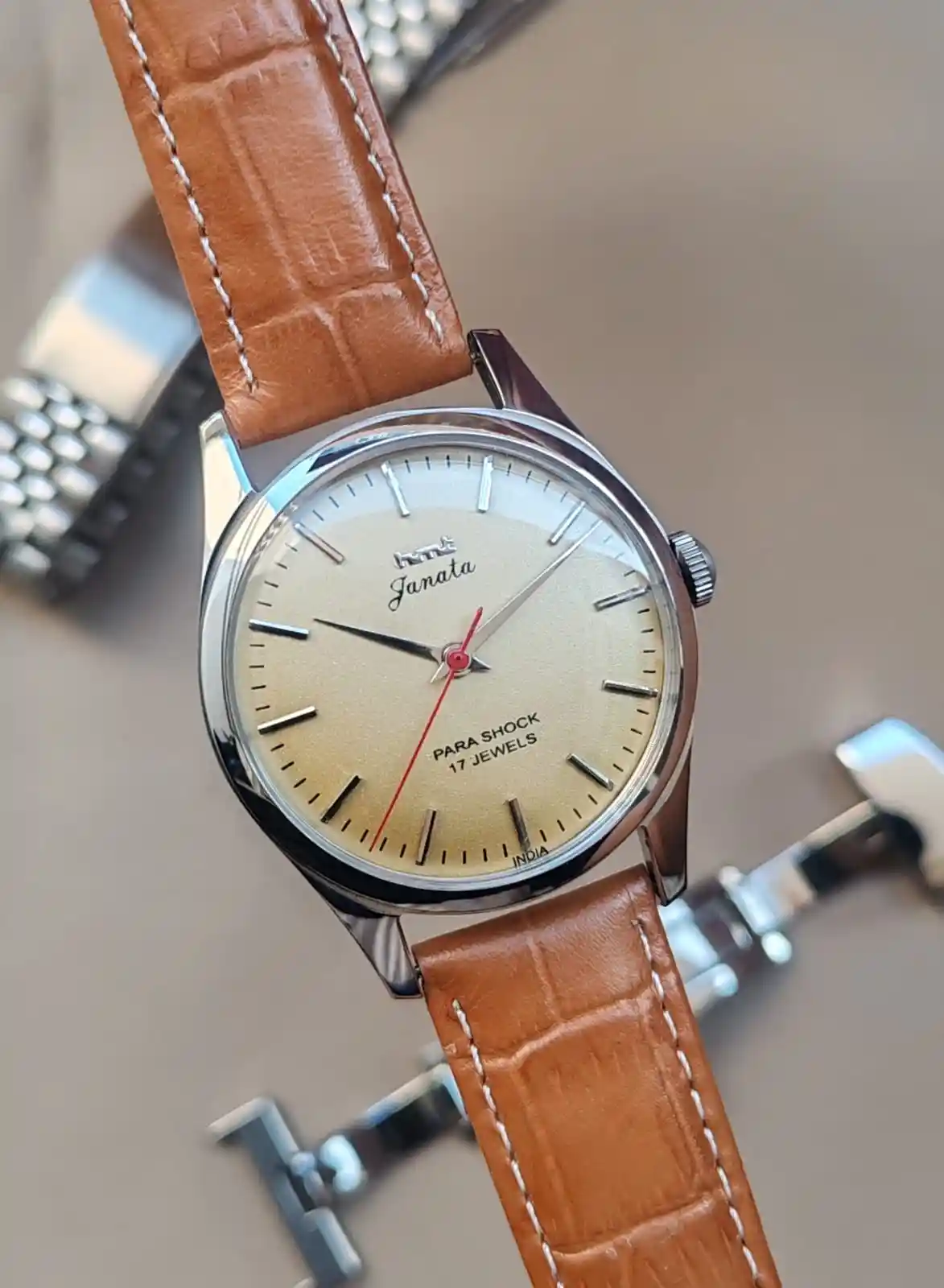 This is Hmt Janata Beautiful Yellowish Gold Dial mechanical handwinding authentic 0231A 17 jewels hmt movement wrist watch.