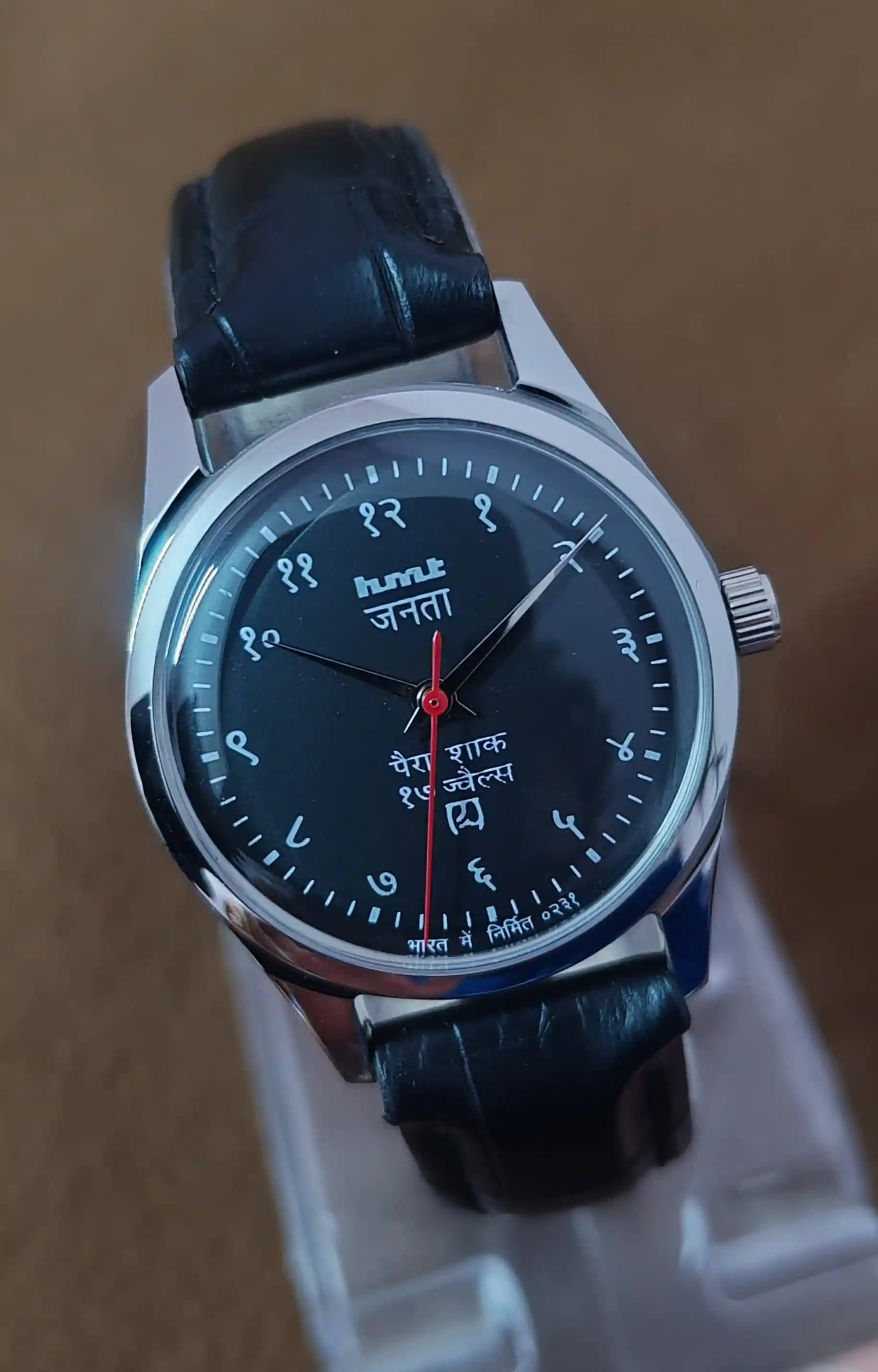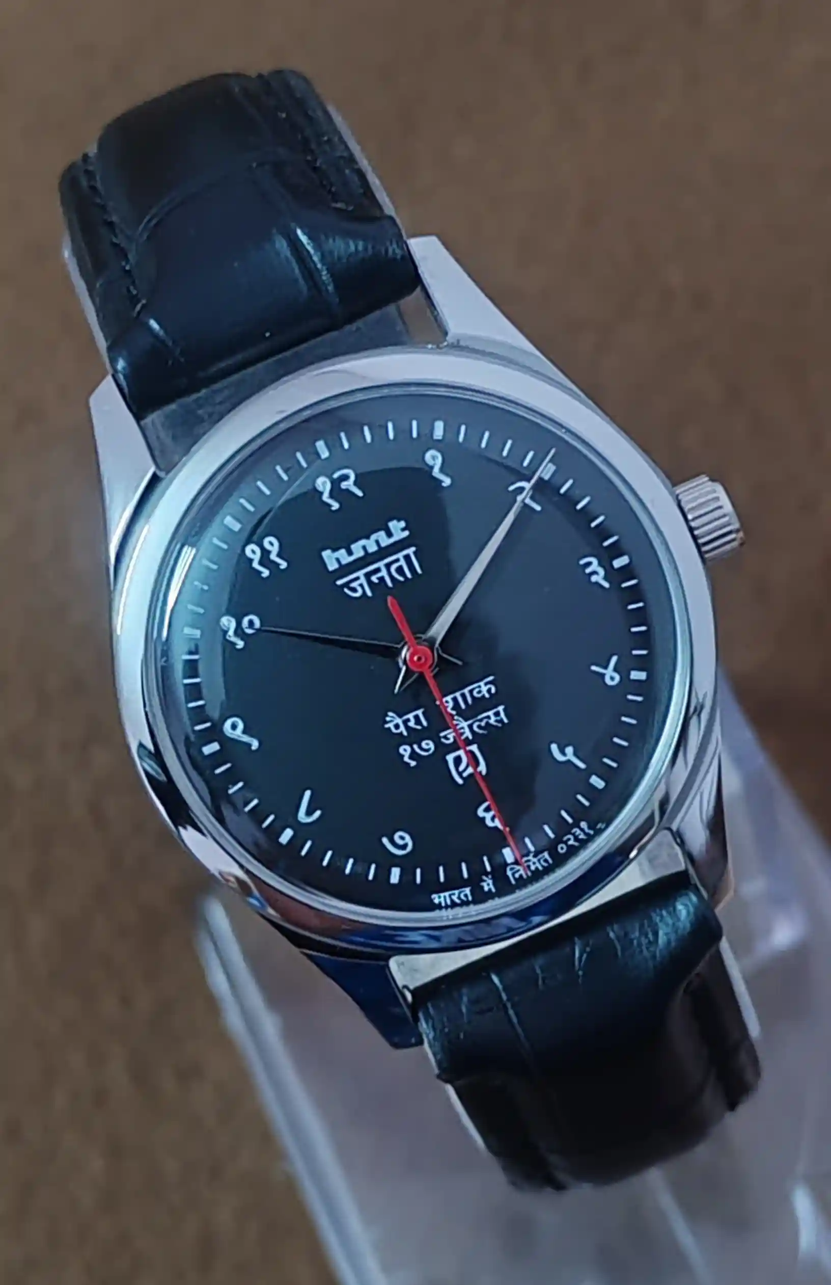 This is Hmt Janata Devnagari Beautiful Black Dial mechanical handwinding authentic 0231A 17 jewels hmt movement wrist watch.