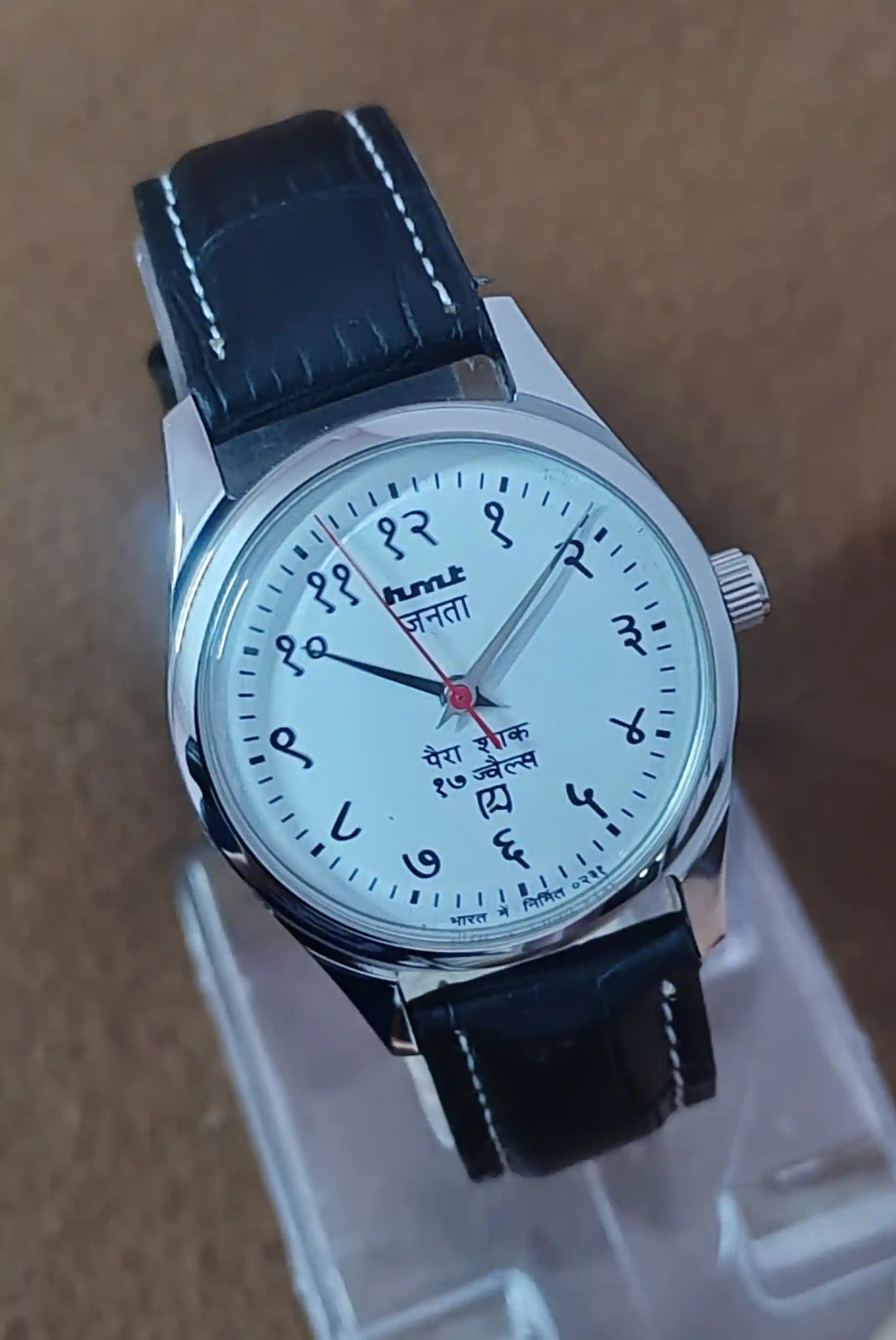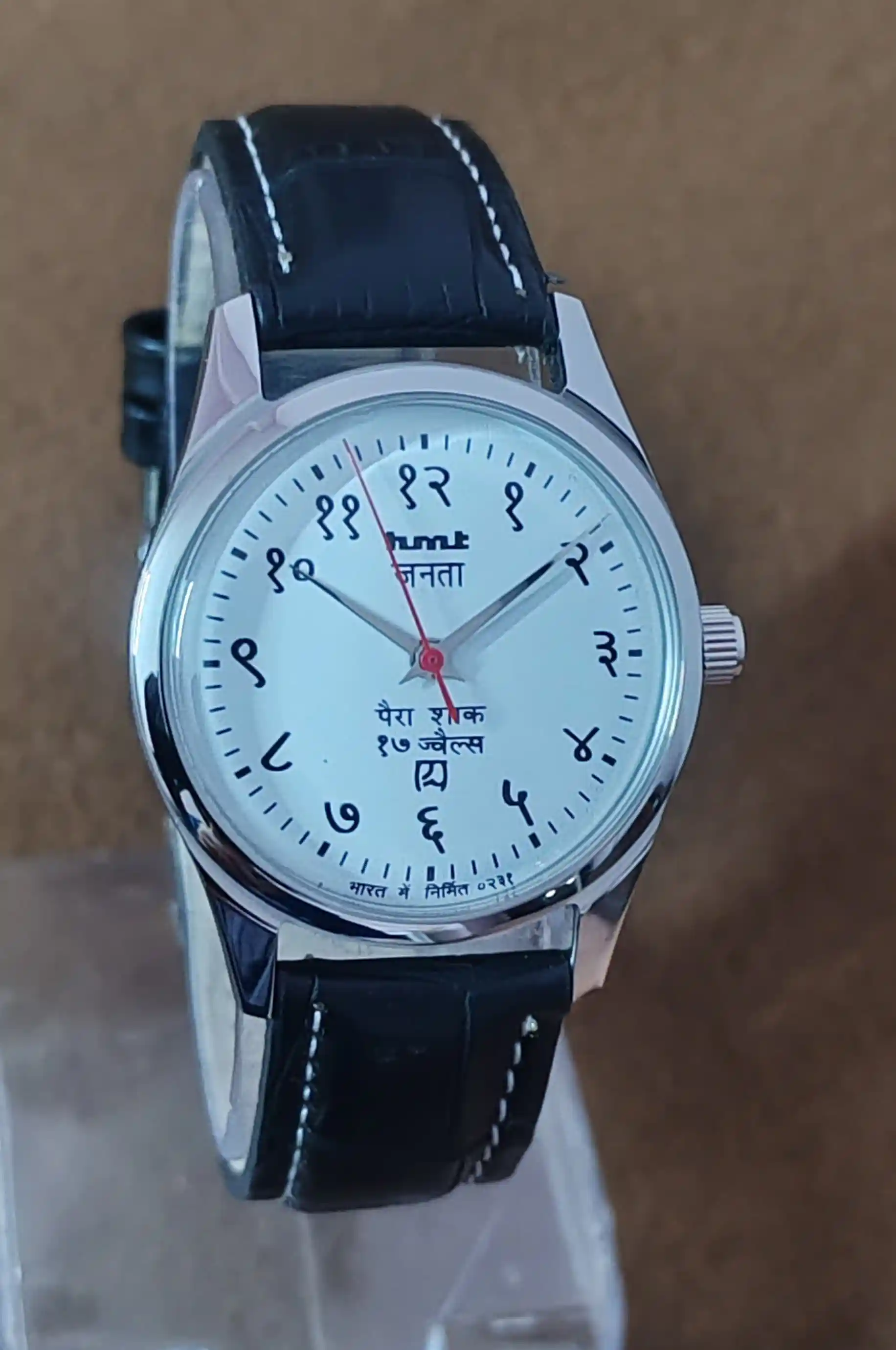 This is Hmt Janata Devnagari Beautiful White Dial mechanical handwinding authentic 0231A 17 jewels hmt movement wrist watch.