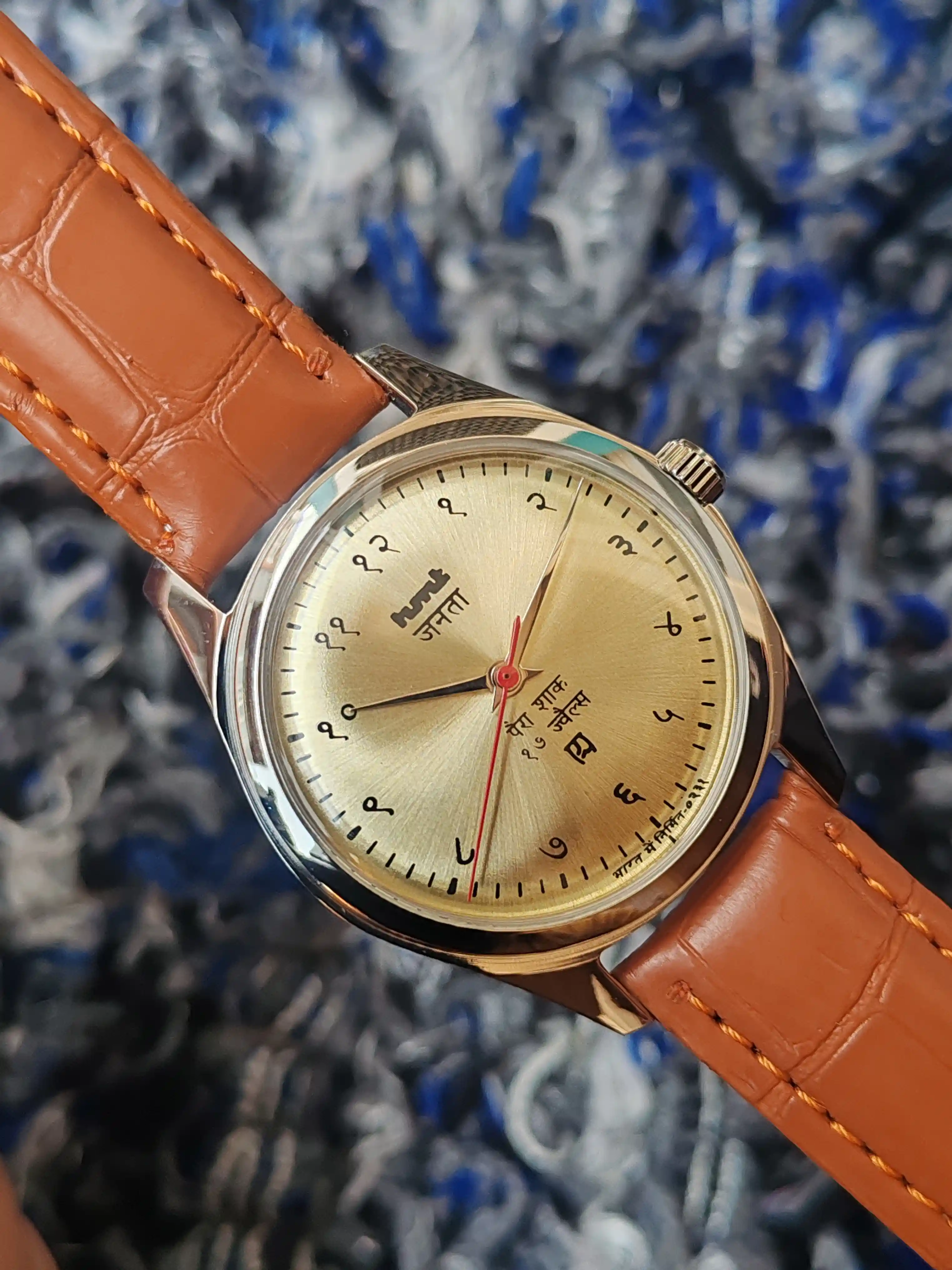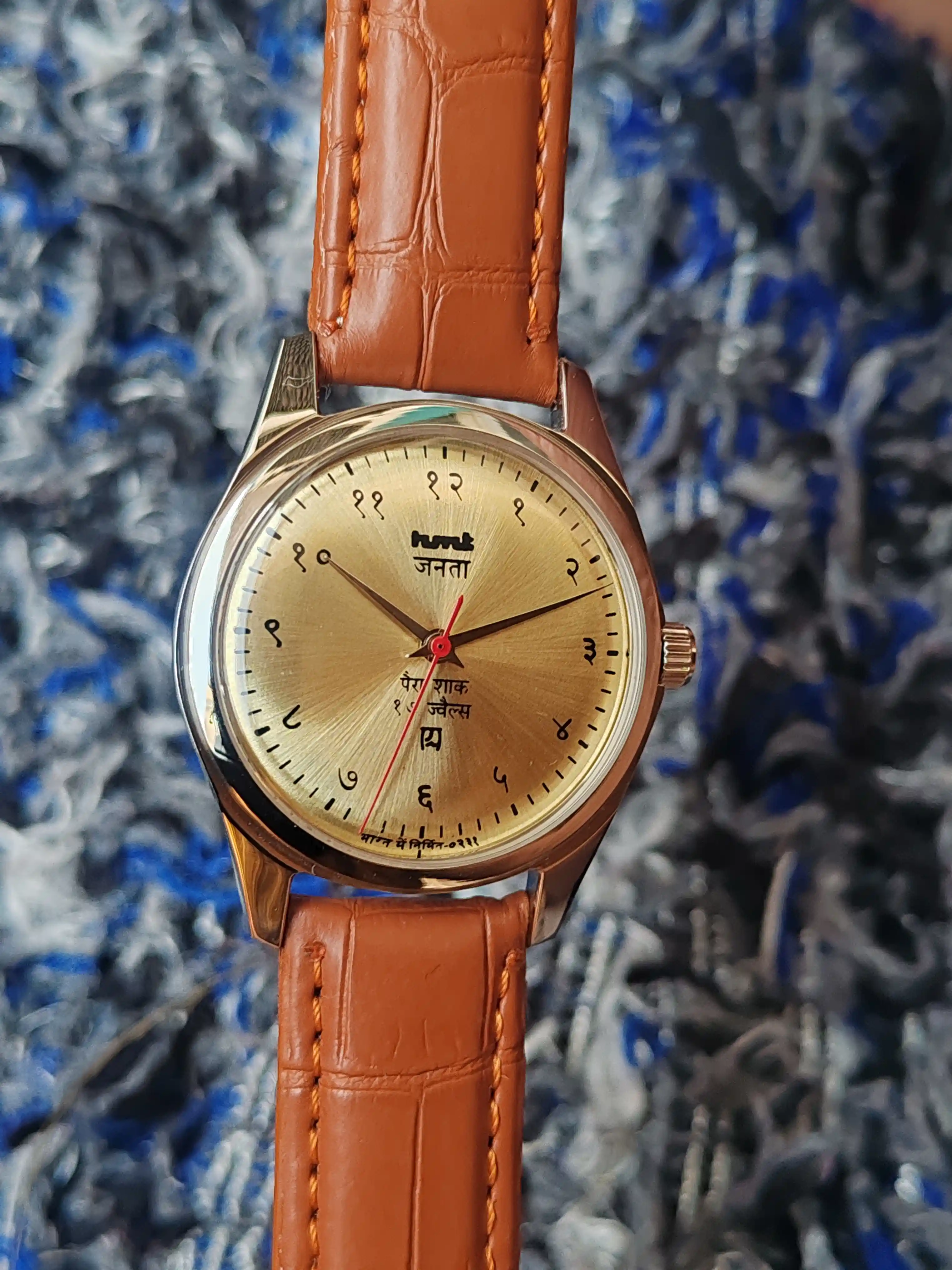 This is Hmt Janata Sunburst Devanagari Golden Dial mechanical handwinding authentic 0231A 17 jewels hmt movement wrist watch.
