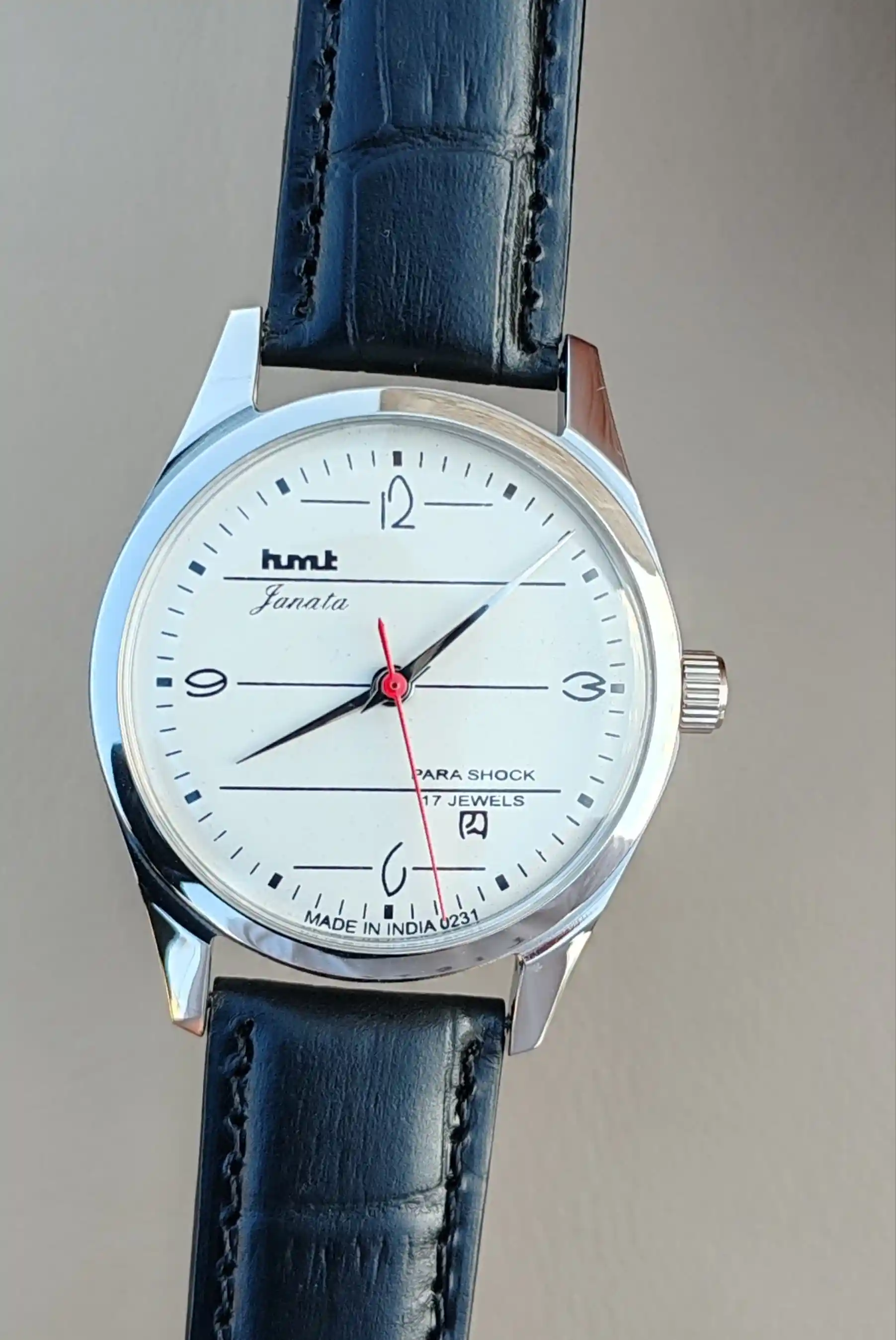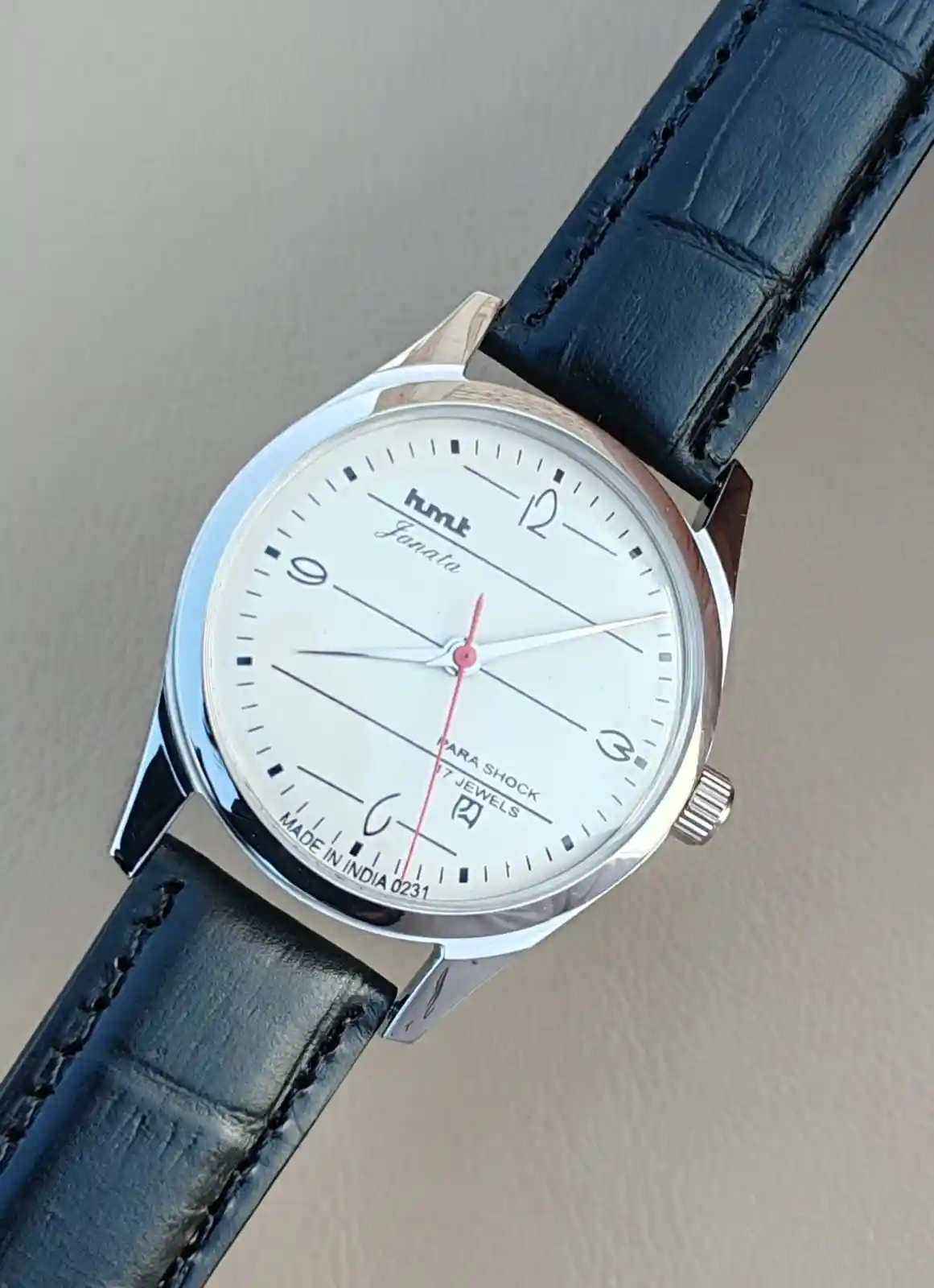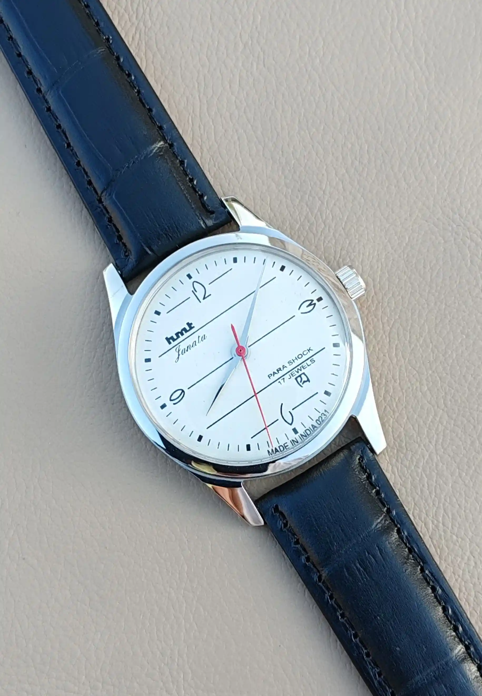 This is Hmt Janata Beautiful White Dial mechanical handwinding authentic 0231A 17 jewels hmt movement wrist watch.