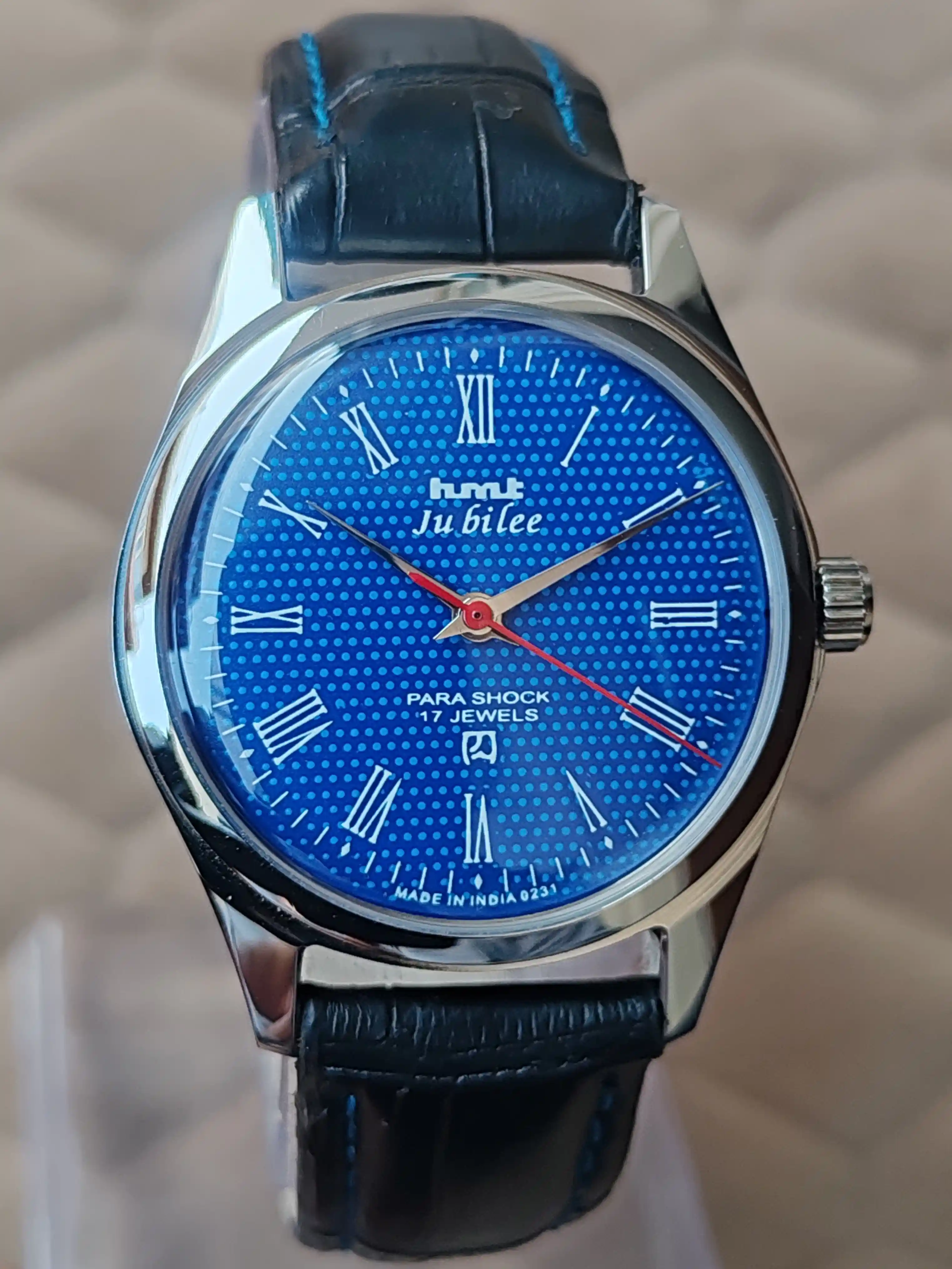 This is Hmt Jubilee Beautiful Blue Dial mechanical handwinding authentic 0231A 17 jewels hmt movement wrist watch.