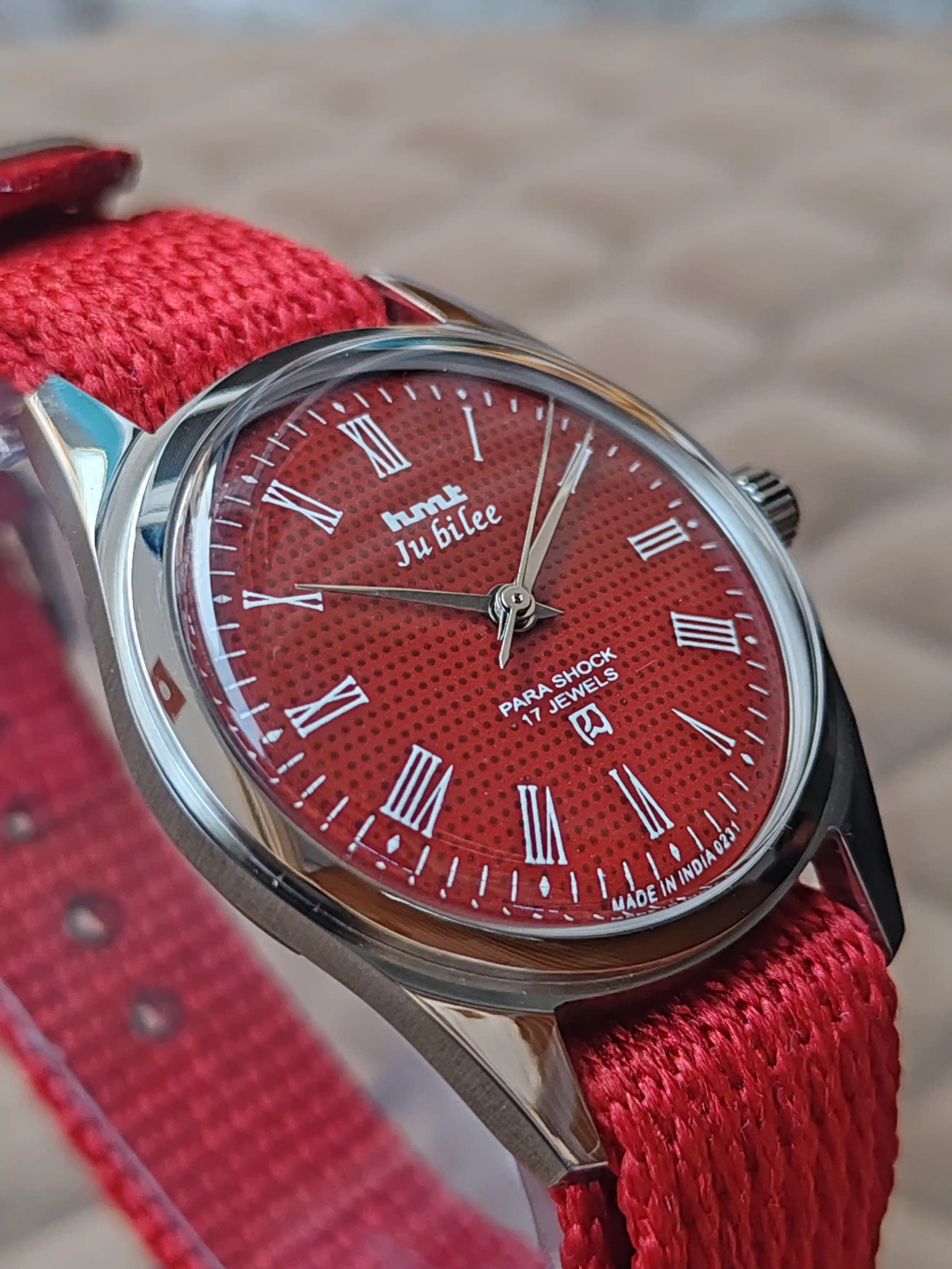 This is Hmt Jubilee Beautiful Red Dial mechanical handwinding authentic 0231A 17 jewels hmt movement wrist watch.