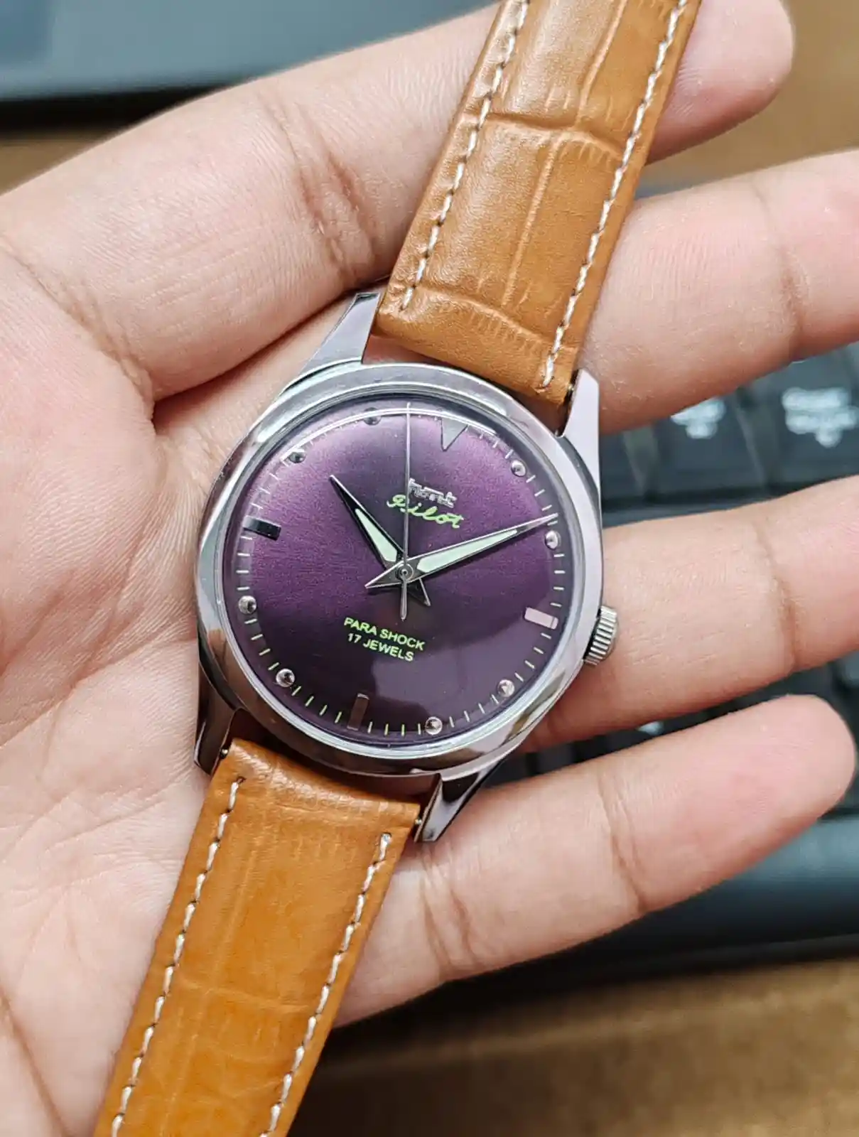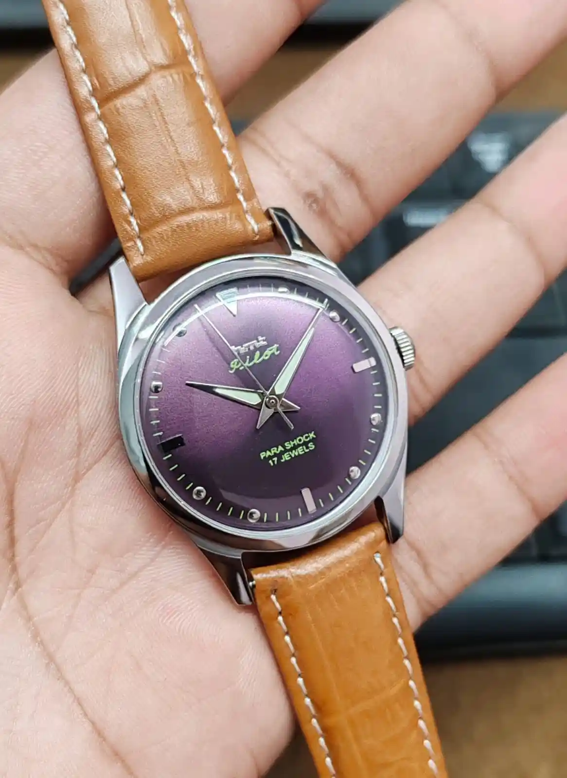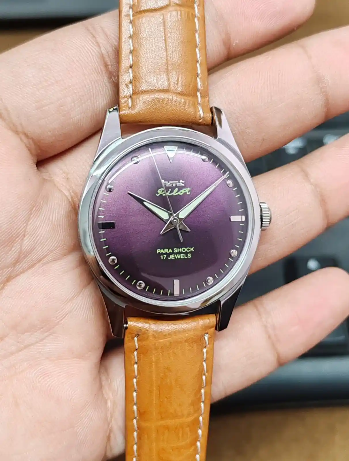 This is Hmt Pilot Beautiful Classic Purple Dial mechanical handwinding authentic 0231A 17 jewels hmt movement wrist watch.